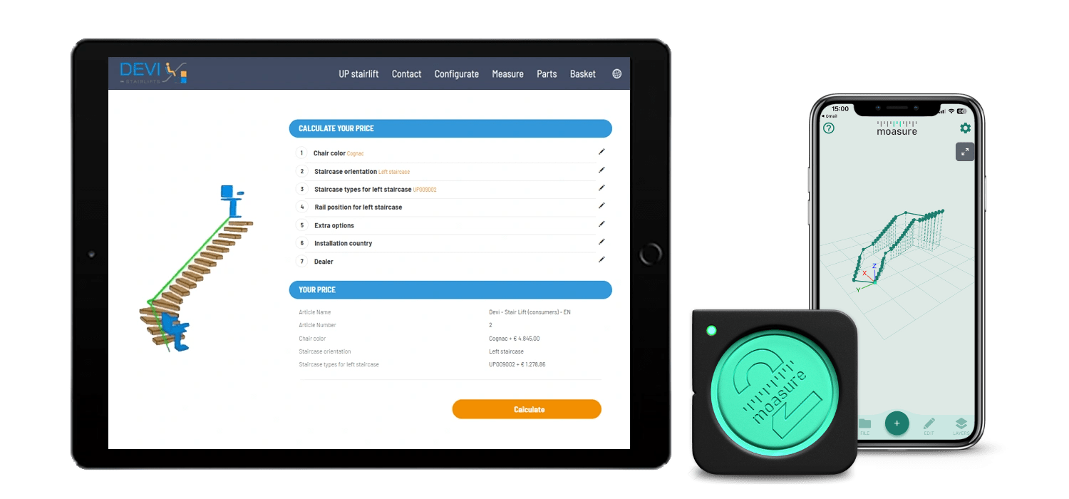Once the measurement is complete, data captured by Moasure®can be instantly transferred to UP Stairlift's webshop configurator where an itemised list of components is generated.*